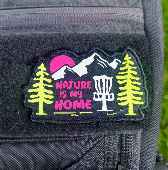 At home with the trees, animals, mountains, streams, and disc golf baskets! Nature Is My Home Disc Golf Patches are durable woven velcro patches, perfect for bags, shirts, jackets or hats.